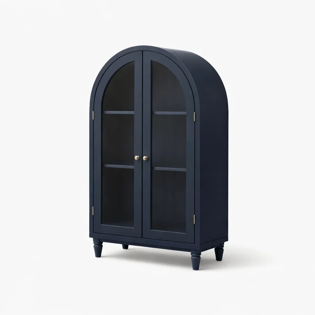 Description:Armario vitrina con diseno curvo y acabado en azul oscuro.