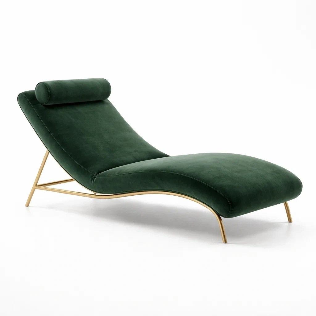 Description:Tumbona de diseno sofisticado con tapizado verde oscuro y estructura metalica en acabado dorado.